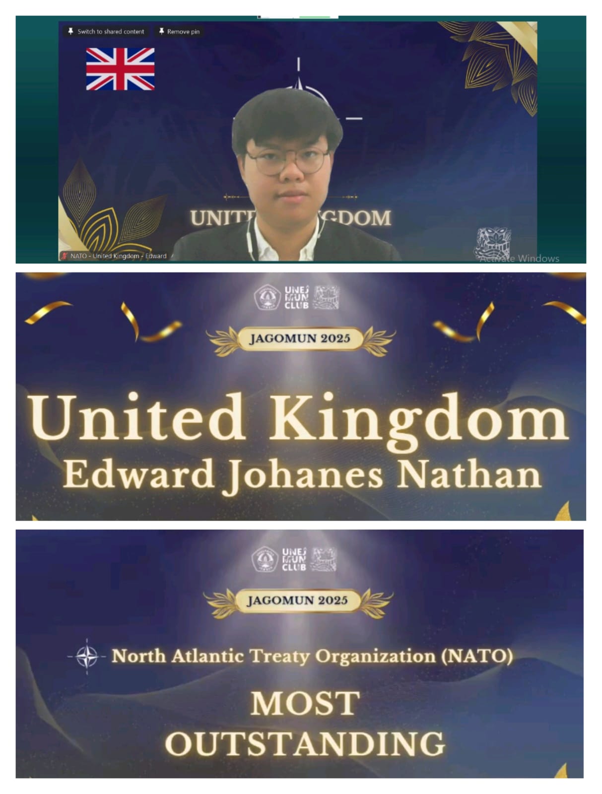 Sambutan dari Ketua HIMHI 2023 Sthefanny (atas), Sekjur Global Class (kiri bawah), Pembina HIMHI (kanan bawah)