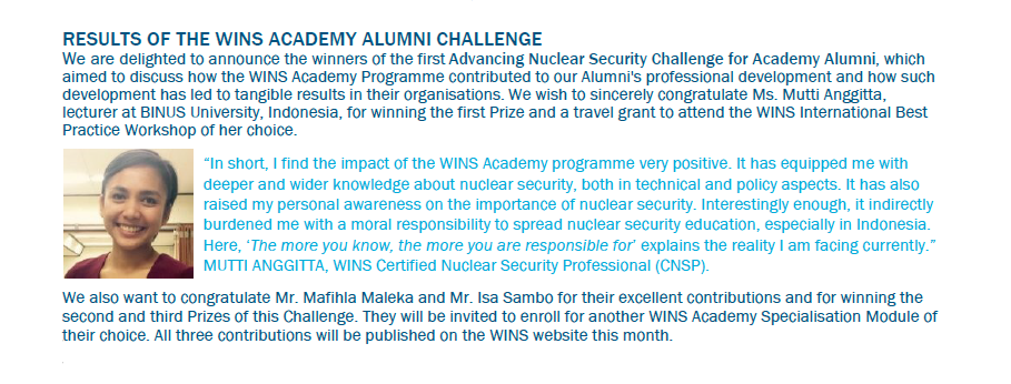 Salah seorang Faculty Member Departemen Hubungan Internasional Universitas Bina Nusantara, Mutti Anggitta,memenangkan kompetisi esai World Institute for Nuclear Security (WINS). Kompetisi ini diikuti para alumni program sertifikasi online WINS yang diselenggarakan pada Maret 2015-Januari 2016. Sebagai pemenang kompetisi esai WINS, Mutti memperoleh kesempatan melaksanakan workshop tentang nuklir yang diadakan oleh WINS di London pada 25-27 Mei 2016 dengan tema Countering Homegrown Violent Extremism in the Nuclear Sector.