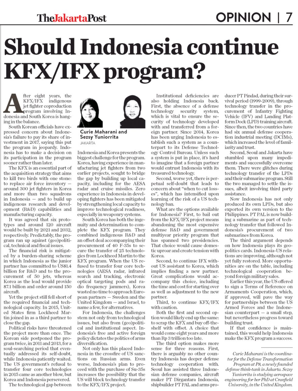 Should Indonesia Continue KFX/IFX Program? Activities Faculty Member Activities Featured IR thinkers World Class Thinkers World News Commentaries Curie Maharani is the Coordinator for the Defense Transformation Program at P8 (a newly founded defense think-tank) and Lecturer in International Relations Department BINUS University Share It :