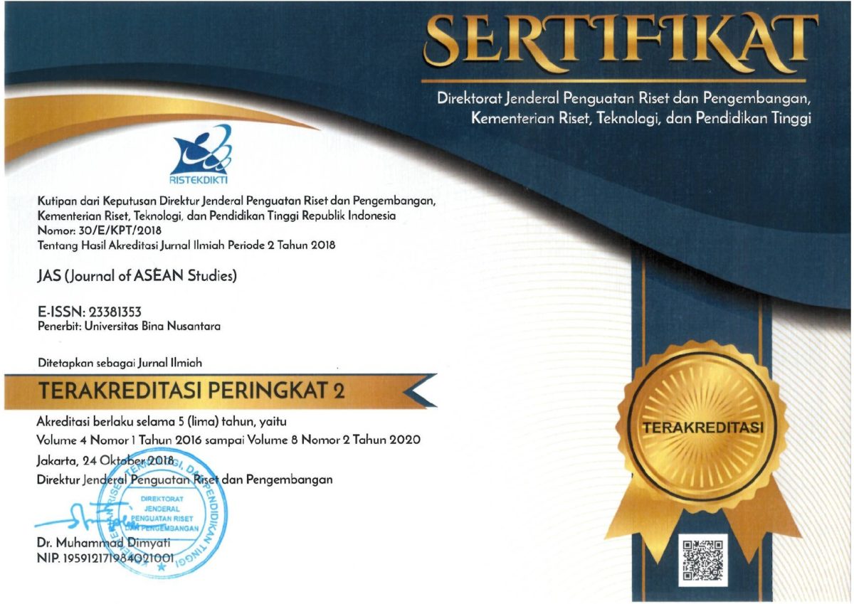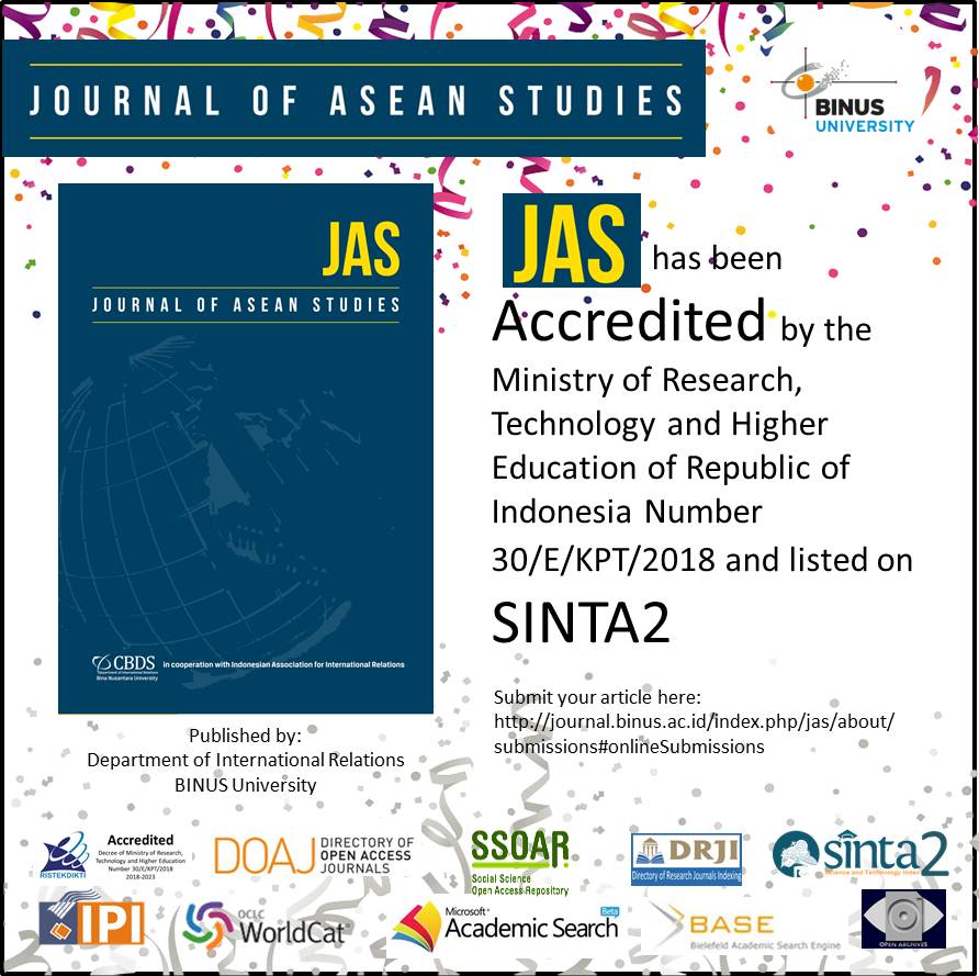 We are pleased to inform our readers that JAS (Journal of ASEAN Studies) is now nationally accredited based on the Decree of the Director General of Strengthening for Research and Development, Ministry of Research, Technology, and Higher Education No. 30/E/KPT/2018 on the Accreditation Rankings of Scientific Journals Batch II 2018. JAS is ranked under SINTA 2 which is currently the highest achievement for Indonesian journals on International Relations. This acknowledgement by the Indonesian government conveys a message for our readers that JAS has been consistently improving its quality as among the most referred journal in Indonesia in the field of International Relations. It is also our expectation that this accreditation would motivates scholars to write for JAS and together with JAS developed our academic reputation in the international community.