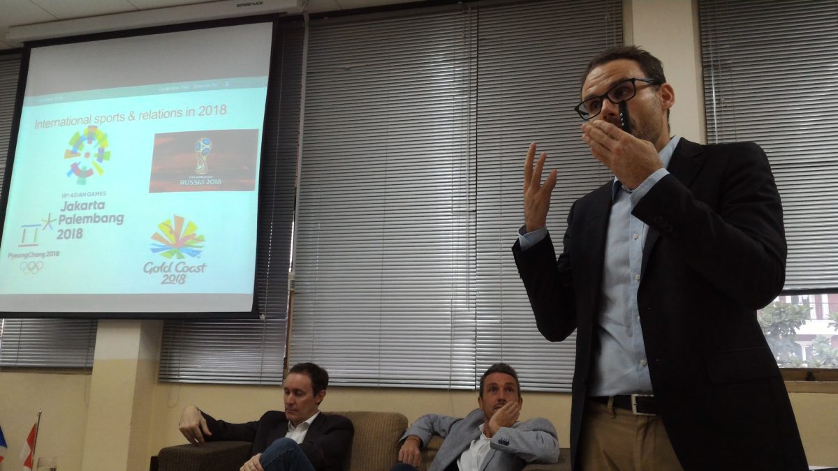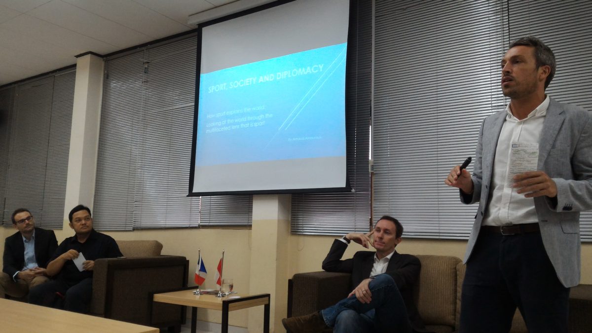 Pembicara selanjutnya, Cyrille Bret mengamati sports saat ini lebih pada upaya untuk menggalang investasi keuangan dan keterlibatan pihak swasta (terutama jika event sports tersebut diadakan oleh pemerintah), dan memobilisasi dukungan public terhadap pemerintah yang berkuasa. Bret memberi contoh penyelenggaraan Piala Dunia 2018, di Russia, merupakan media bagi Presiden Russia, Vladimir Putin, untuk menggalang dukungan dari rakyat Russia, karena akan mencalonkan diri lagi di Pemilu Presiden mendatang.
