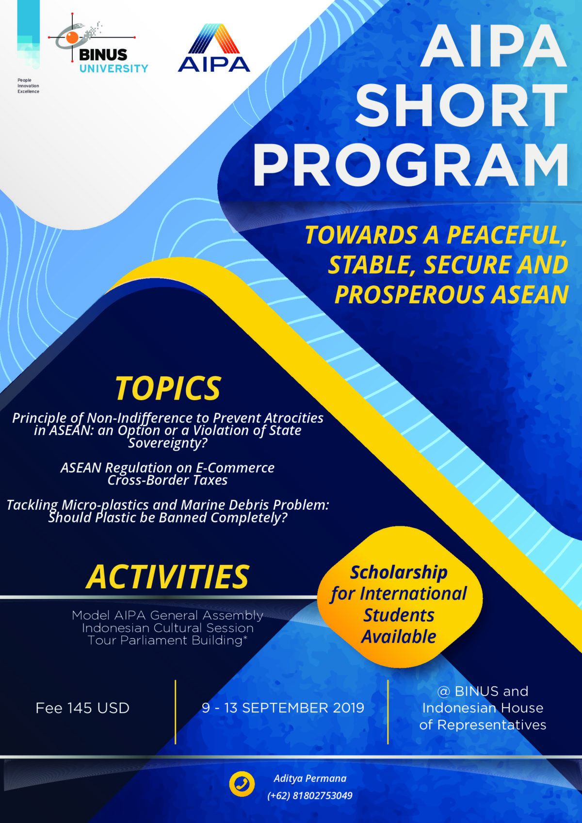 This year, the 3rd Model AIPA aims to invite students from 10 ASEAN Member States. With the theme “Model AIPA: Towards a Peaceful, Stable, Secure and Prosperous ASEAN”, The 3rd Model AIPA will take place from 9-13 September 2019 in DPR-RI (House of Representatives) Compound in Jakarta.