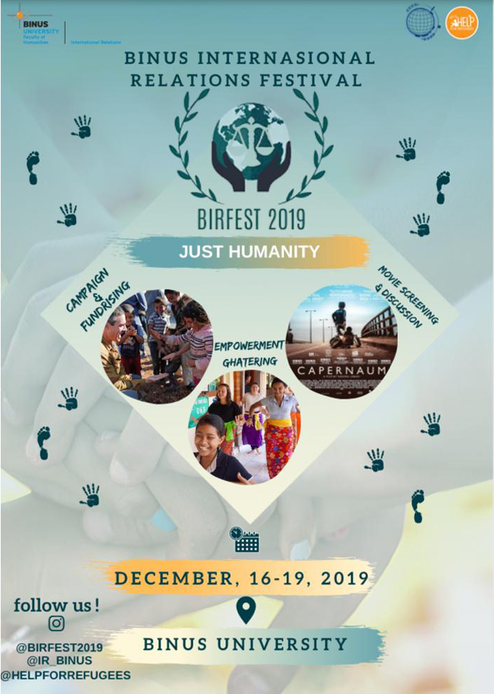 As part of the BINUS International Relations Festival (BIRFEST) with this year’s theme ‘Just Humanity,’ the Department of International Relations in collaboration with the BINUS IR Students Association (HIMHI) presents Movie Screening and Discussion for “Capernaum.” BIRFEST 2019 begins with a visit by students of HELP for Refugees to BINUS University, is followed by a 2-day fundraising campaign, and is concluded with this movie screening event. In addition to raising funds that will be donated to HELP for Refugees, this event aims to raise awareness of both students and lecturers of BINUS University about the refugee situation in Indonesia and, in general, the human rights impact of forced displacement.