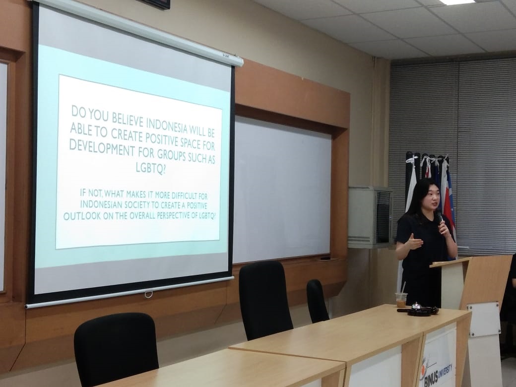 Sabtu, 09 Februari 2020 – International Relations Department kedatangan representasi mahasiswa magister dari Korea University dengan menyelenggarakan Focus Group Discussion (FGD) bersama para partisipan dari mahasiswa HI Binus University dan dihadiri oleh Ratu Ayu Asih Kusuma Putri selaku perwakilan dosen dari International Relations Department Binus University. Topik yang dibahas dalam FGD tersebut yaitu “LGBTQ Human Rights in Indonesia and how Influential the Factors of Culture, Religion, and Tradition is”. FGD ini diawali dengan presentasi dari Hyunjin Lee, seorang mahasiswi magister Korea University yang memaparkan fakta dan isu seputar situasi LGBTQ di Indonesia.