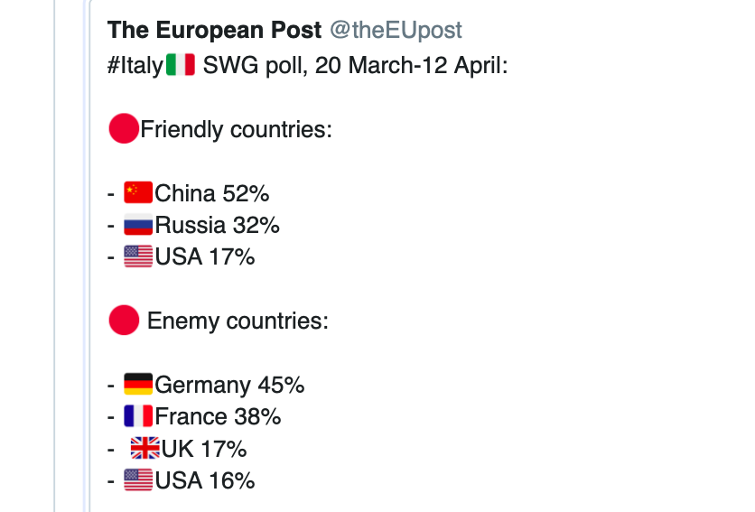 To give a better understanding on the relationship between EU and Italy, there is a poll conducted by Monitor Italia published on March 13, stated that 88% of Italians believe that the European Union is not helping Italy in their fight against coronavirus. 67% consider that belonging to the EU is a disadvantage compared to 47% in November 2018, the date of the previous survey. One more poll is telling us that China is even more friendly compared to Italy’s neighboring countries.