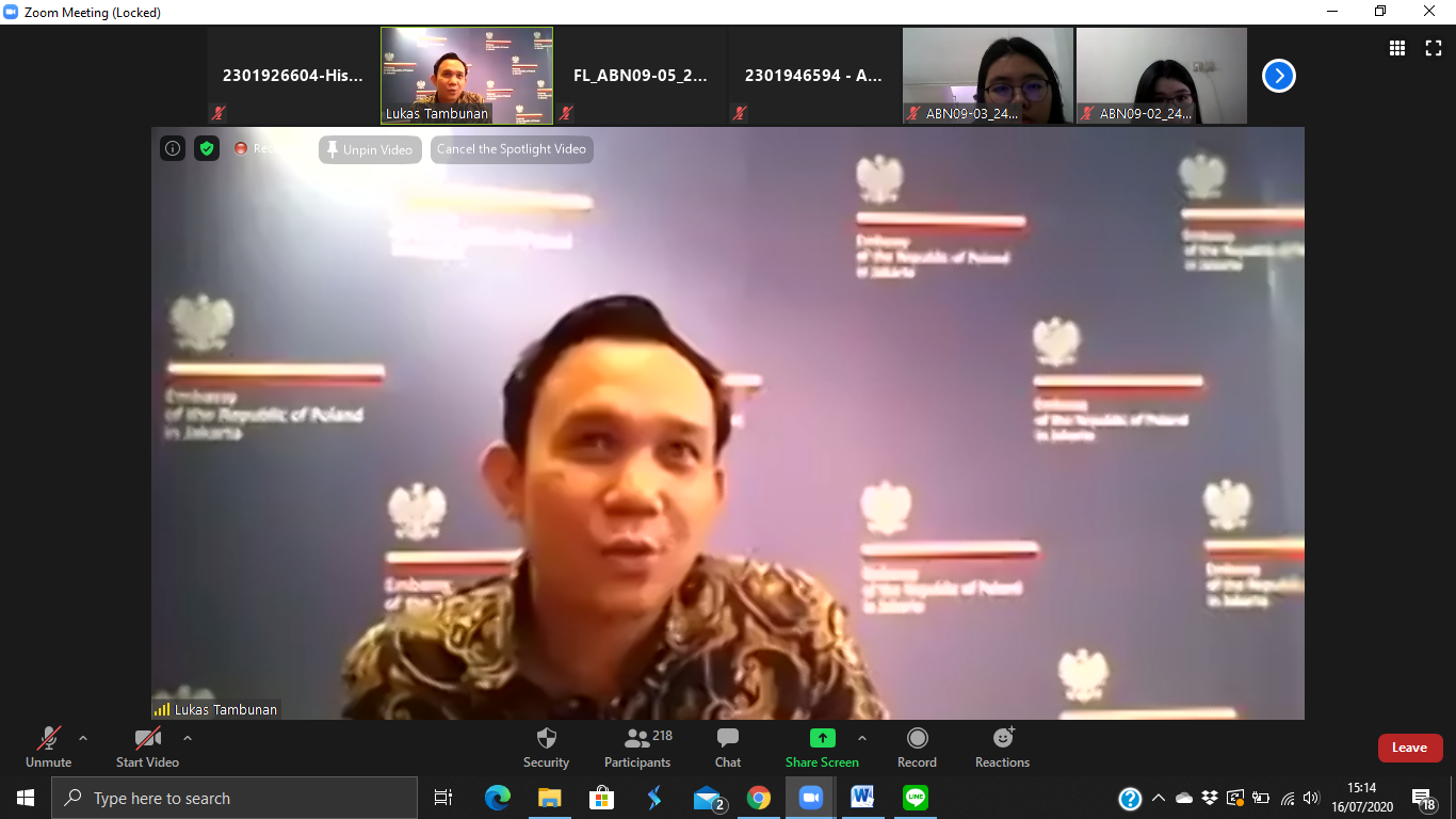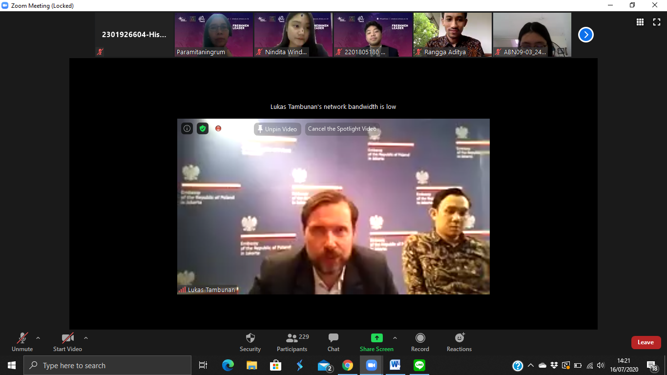 On July 16, 2020, the International Relations Department of Bina Nusantara University held a Public Lecture with the theme “Life as Diplomat amid Covid-19 Pandemic”. The Public Lecture presented speakers from the Polish Embassy to Jakarta, The Honorable Mr. Piotr Firlus, Charges d’Affair of the Embassy of the Republic of Poland in Jakarta. In his session, Mr. Piotr introduced Poland in general as Indonesia’s partner country in various fields.