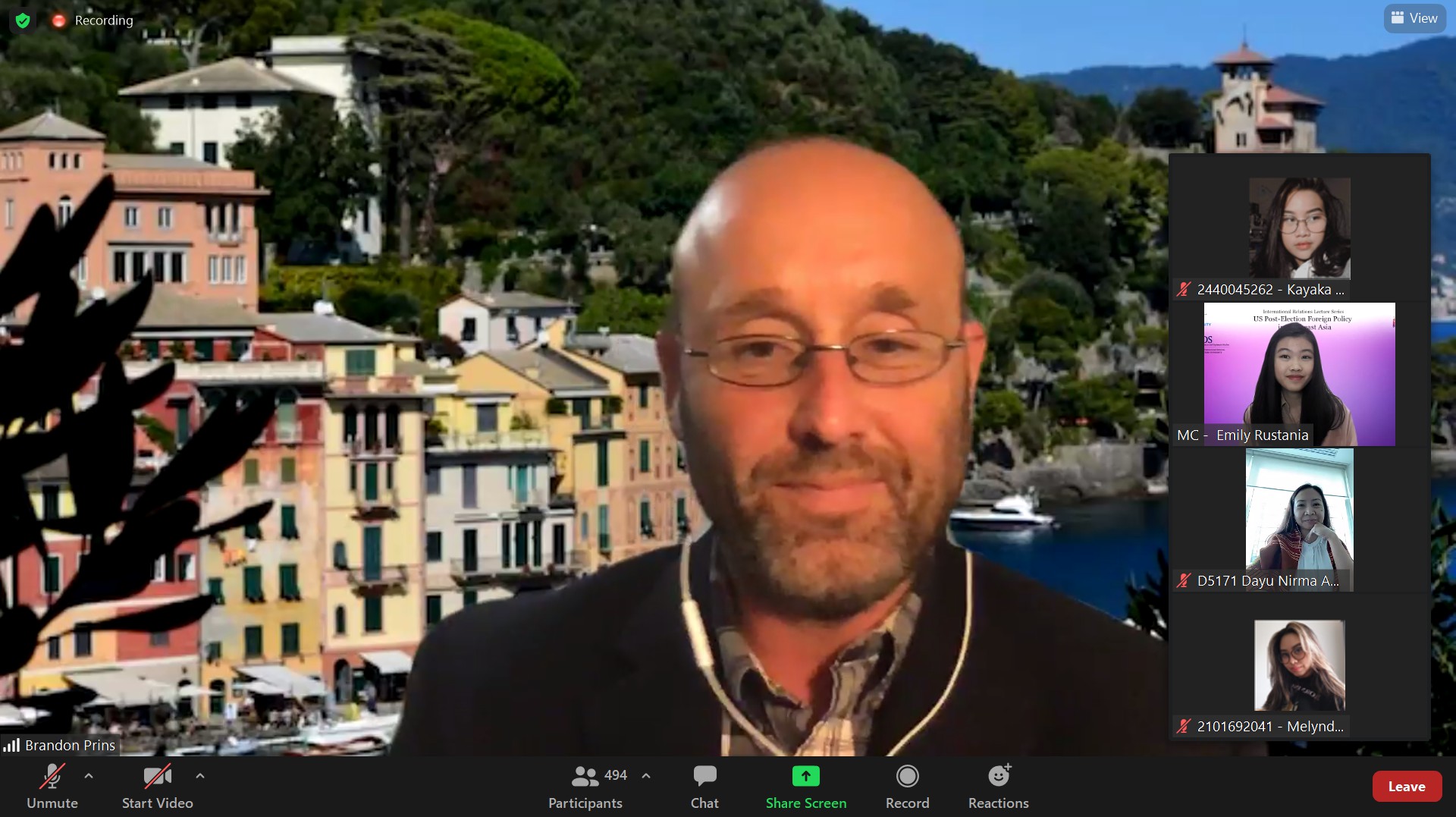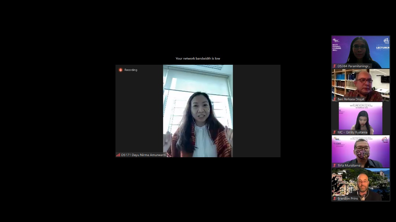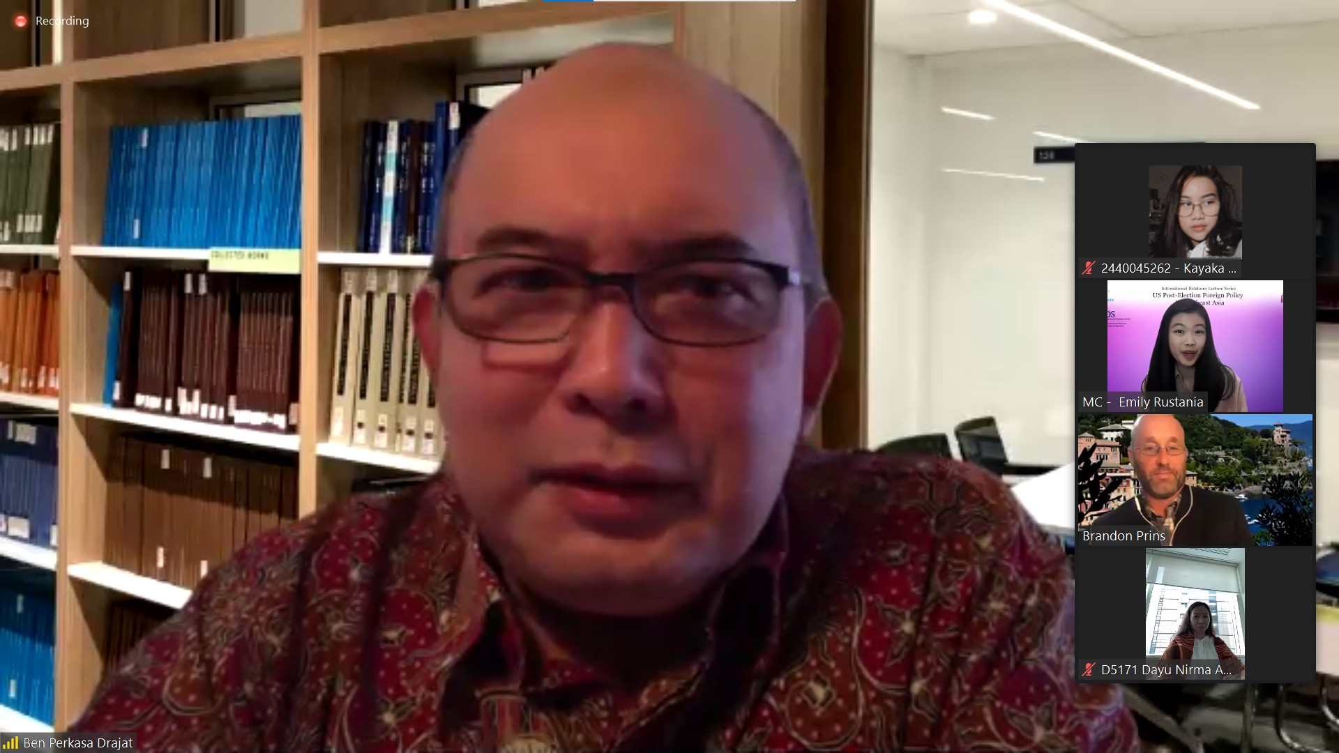 Moderated by Dayu Nirma Amurwanti, lecturer from Department of IR Bina Nusantara University, the webinar presents insightful perspectives from a prominent foreign policy scholar and a high-ranked diplomat as CBDS aims to provide “a bridge” for IR scholars and diplomatic corps to discuss this timely issue, especially by looking at the consequences of the US presidential election for the South East (SE) Asia region. The first speaker is Professor Brandon Prins from the University of Tennessee-Knoxville (USA). Currently, he serves as co-lead editor of a prominent IR journal, International Studies Quarterly (ISQ).