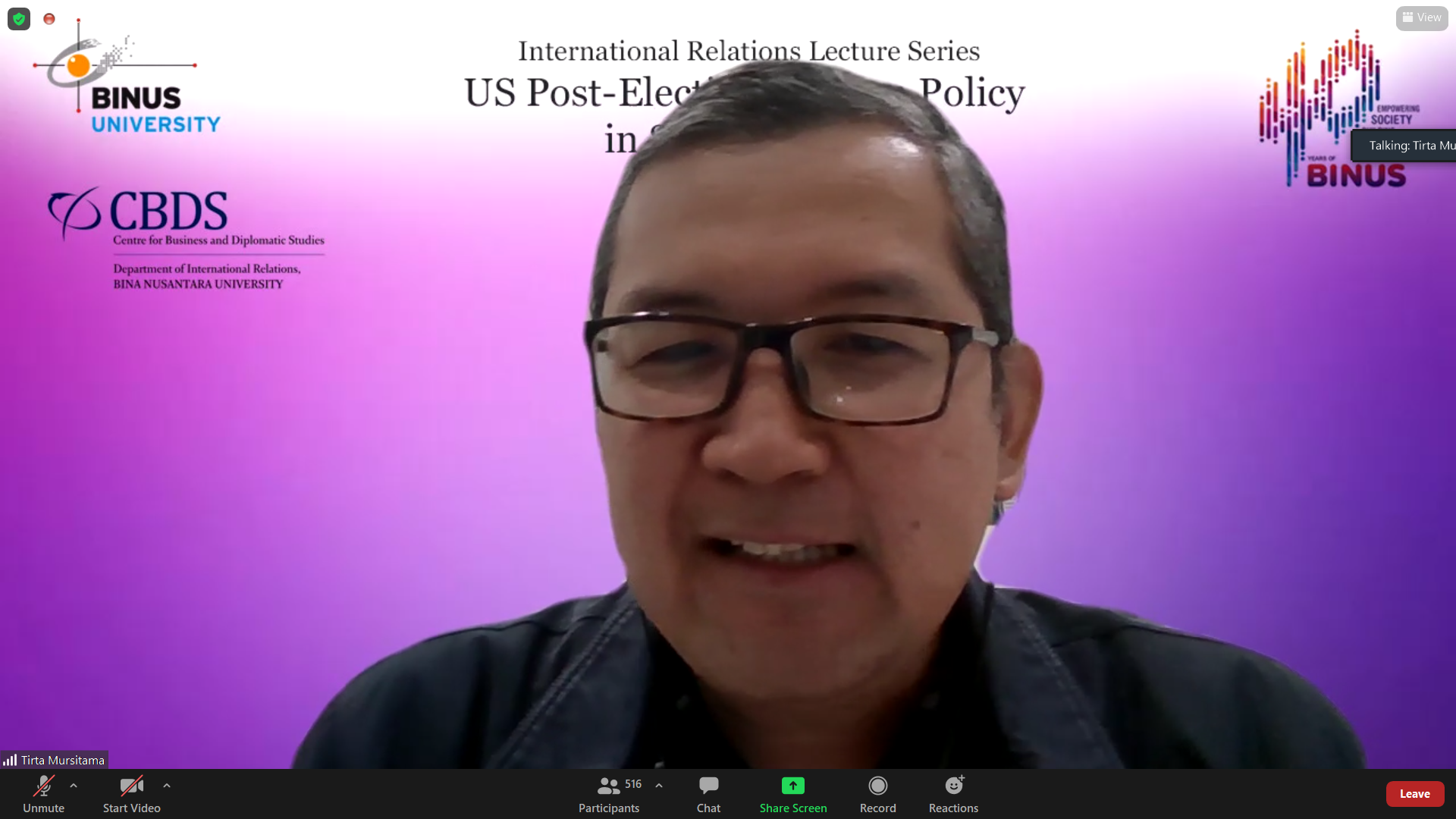 On October 22nd 2020, the Centre for Business and Diplomatic Studies (CBDS) International Relations (IR) department at Bina Nusantara (BINUS) University is organising a webinar forum on “US post-election foreign policy in SE Asia”. This event is in line with CBDS’s commitment to promote research and deliberation on diplomacy, business, international relations, and developmental issues particularly in Indonesia, Southeast Asia, and the Asia Pacific.