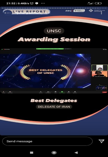 During the awarding session, I was named Best Delegate. I received this award as the delegate of Iran. I was recognized for providing the most realistic solution. This solution included a tangible mechanism for dispute settlement. It also emphasized a strong legal basis.