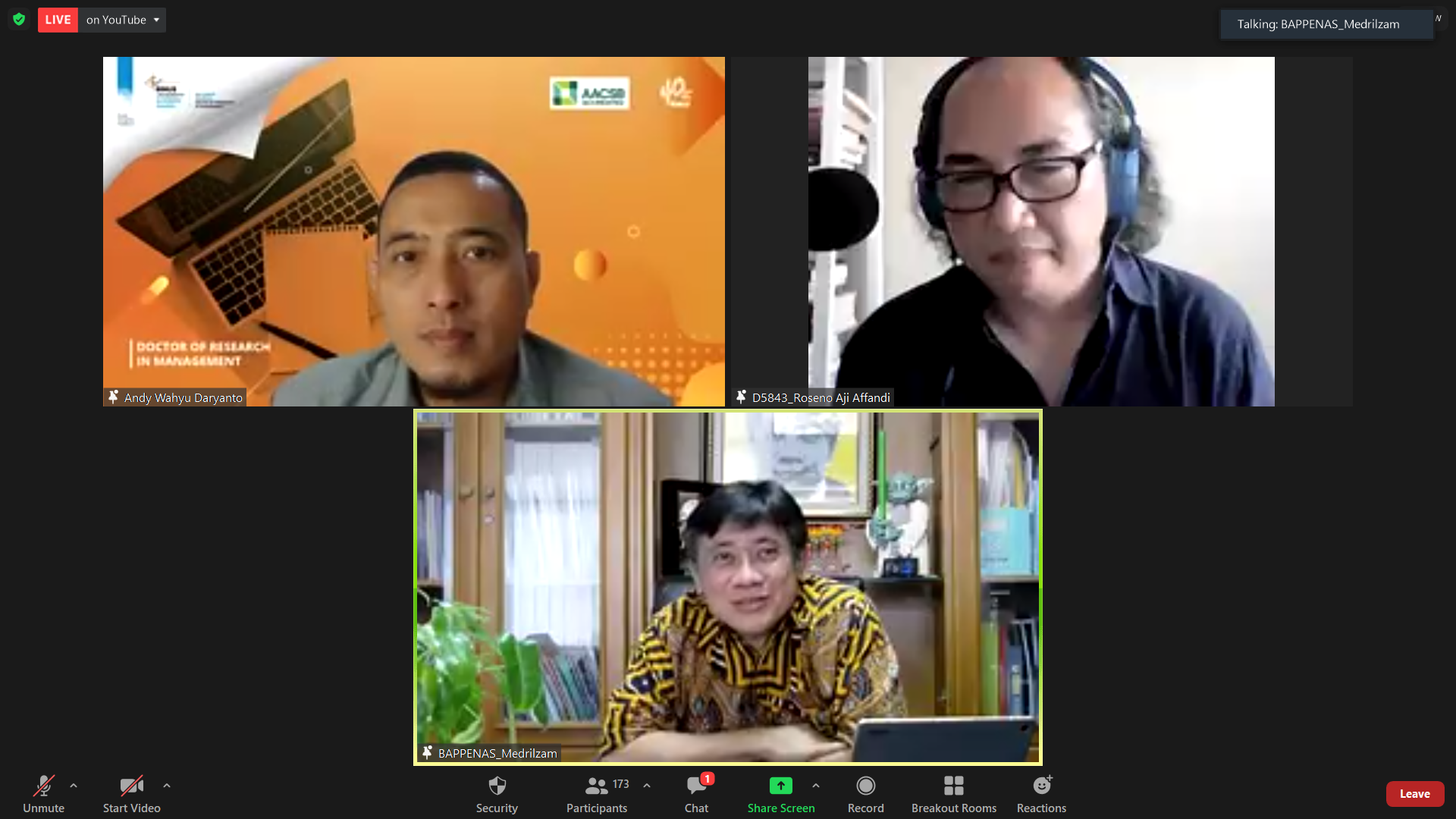 Sesi pertama dibawakan oleh Bapak Medrilzam mendiskusikan mengenai keterkaitan Covid-19, Climate Change, dan Sustainable Developement. Selama Pandemi Covid-19, Indonesia harus melakukan konsolidasi agar dapat bangkit untuk mengejar berbagai ketertinggalan. Frekuensi Ekstrim Event akan sering terjadi sehingga dapat menganggu pertumbuhan ekonomi kedepannya. Jika frekuensi ekstrim kering maka padi tidak dapat menghasilkan, tanaman-tanaman rusak, dan resiko kebakaran hutan. Jika frekuensi basah maka longsor, banjir, dan lain-lain. Dulu, frekuensi ektrim rentang waktunya 8-10 tahun, sekarang bisa 2-4 tahun. Climate change sulit dihindari dan harus ditindak tidak hanya Indonesia tetapi juga Global.