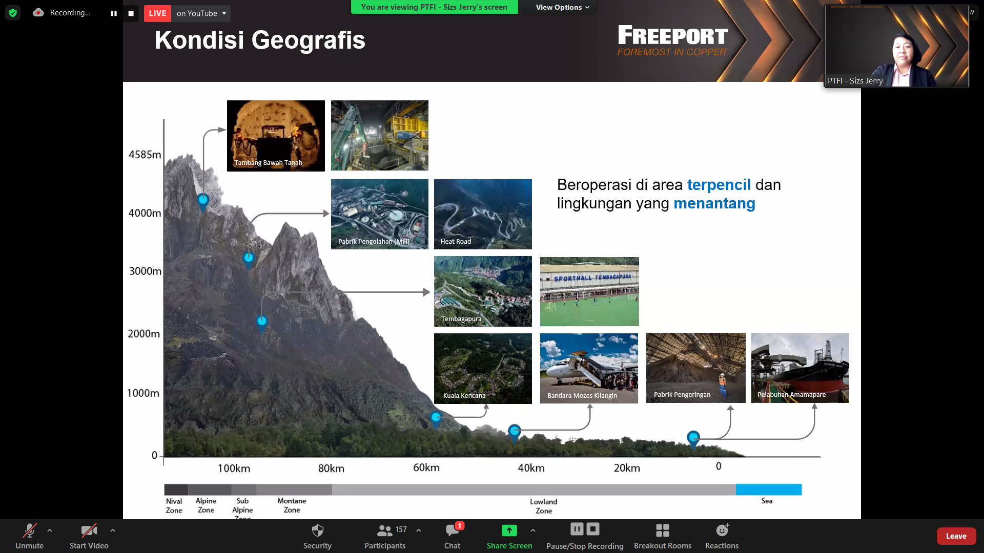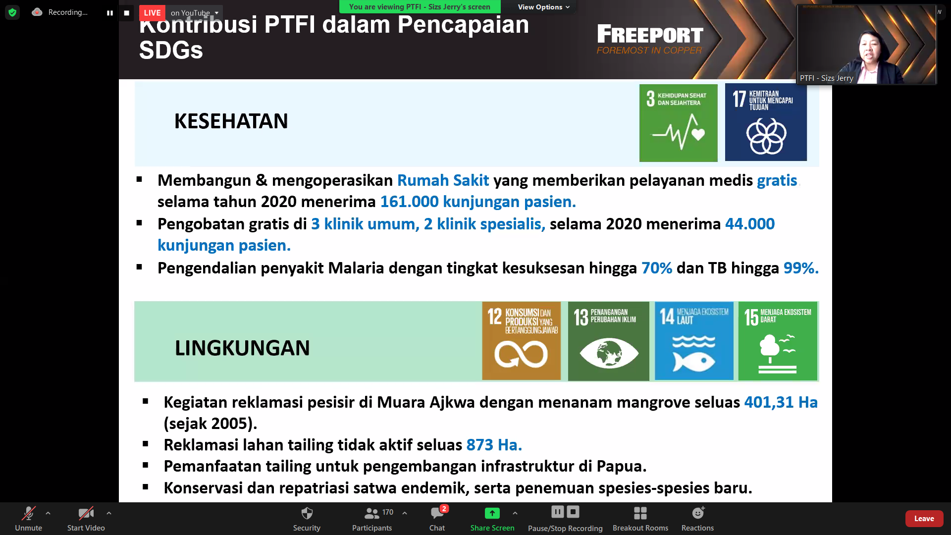 Pembicara dari PT Freeport Indonesia (PTFI) oleh Ibu Sizs Jerry mengenai kontribusi investasi sosial PTFI dalam pencapaian SDGs tambang yang selalu diidentikkan dengan merusak lingkungan. Pemaparan area PTFI yang berlokasi tepat di tengah-tengah pulau Papua dan memiliki dua area, yaitu izin area pertambangan khusus seluas 9.946 Ha sekitar 0,02% dari luas Papua dan area pendukung seluas 116.783 Ha yang diperoleh dua tahun lalu. PTFI beroperasi dari area 0 mdpl hingga di atas 4200 mdpl. Konsekuensinya adalah lokasi bentang alam yang yang harus dijaga lingkungannya cukup beragam, dari vegetasi bakau sampai tundra di bawah gunung es.