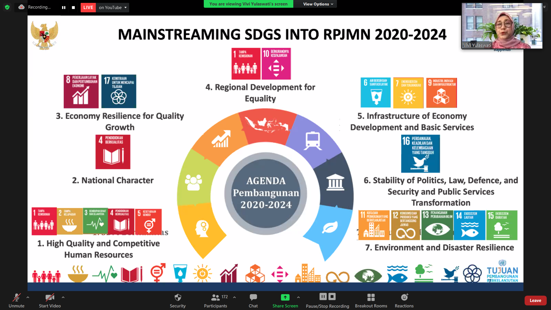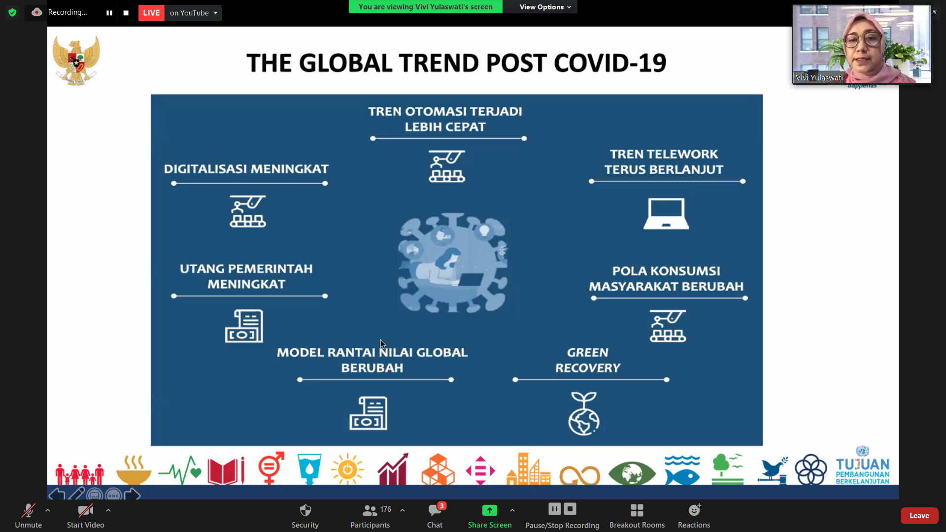 Sesi dari PTFI dilanjutkan oleh ibu Vivi Yulaswati yang menguraikan upaya-upaya Indonesia yang termasuk dari 193 negara yang berkomitmen secara global terhadap agenda-agenda pembangunan global, baik ketika berupa MDGs (2000-2015) hingga berganti ke SDG’s pada periode 2015-2030 yang memiliki lebih banyak indikator. MDGs lebih berfokus pada pembangunan negara-negara berkembang dengan fokus pada pembangunan ekonomi dan sosial, sedangkan SDGs lebih universal dalam mencakup keseluruhan aspek pembangunan berkelanjutan yaitu ekonomi, sosial, dan lingkungan, dengan berfokus pada manusia, kemakmuran, perdamaian, kemitraan, dan planet.