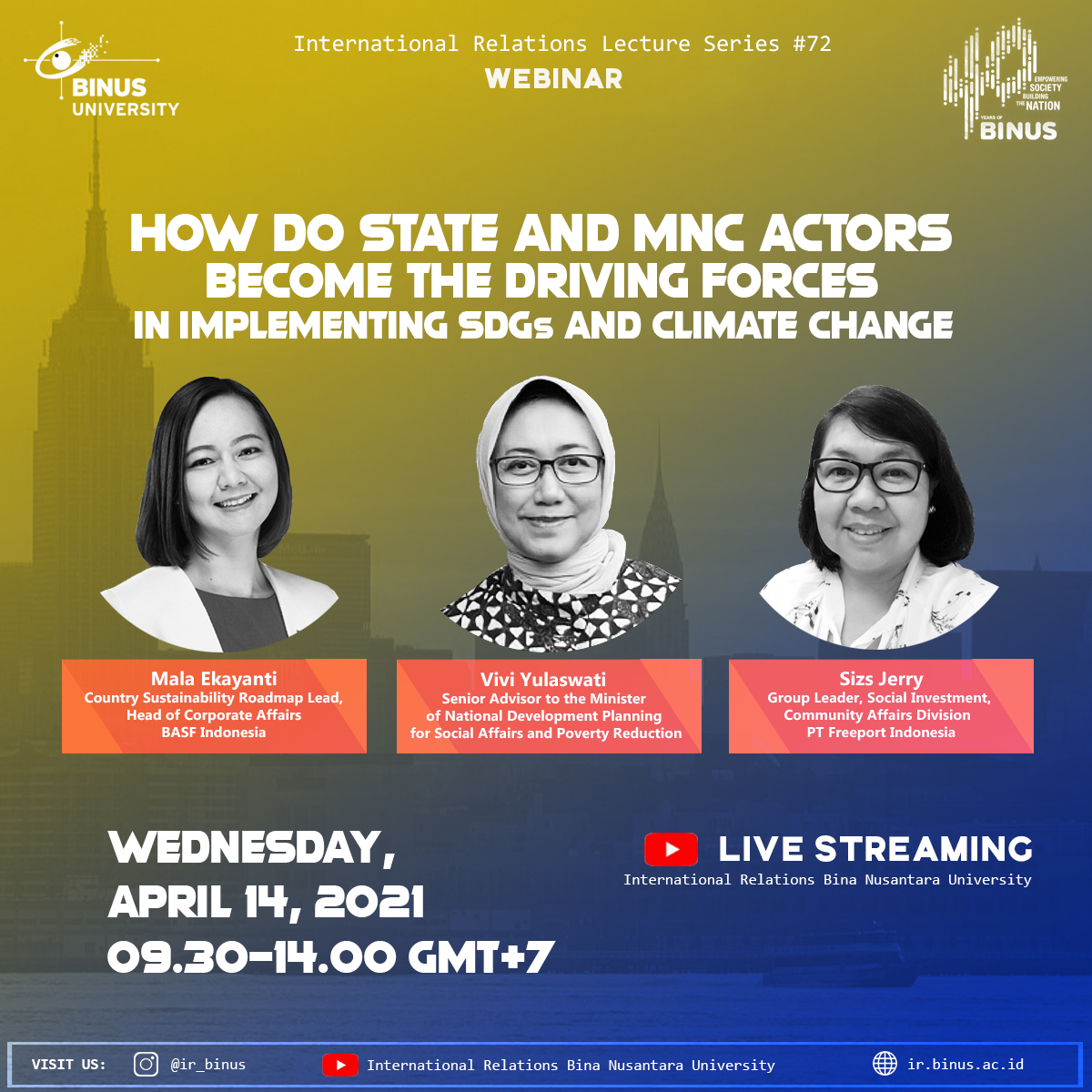 Pada Rabu, 14 April 2021, Jurusan Hubungan Internasional Bina Nusantara University mengadakan webinar di bawah program International Relations Lecture Series (IRLS) yang ke-72 bertajuk “Digital Transformations: Opportunities, Challenges and Threats for Small and Medium Enterprises in the Covid-19 Pandemic Era“. Webinar ini menghadirkan tiga pembicara yakni ibu Mala Ekayanti (Country Sustainability Roadmap Lead, Head of Corporate Affairs BASF Indonesia), ibu Vivi Yulaswati (Senior Advisor to the Minister of National Development Planning for Social Affairs and Poverty Reduction), dan ibu Sizs Jerry (Group Leader, Social Investment,Community Affairs Division PT Freeport Indonesia). Sesi webinar kali ini dimoderasi oleh ibu Dayu Nirma Amurwanti, dosen jurusan Hubungan Internasional Binus yang berpengalaman pula sebagai praktisi dari World Bank.