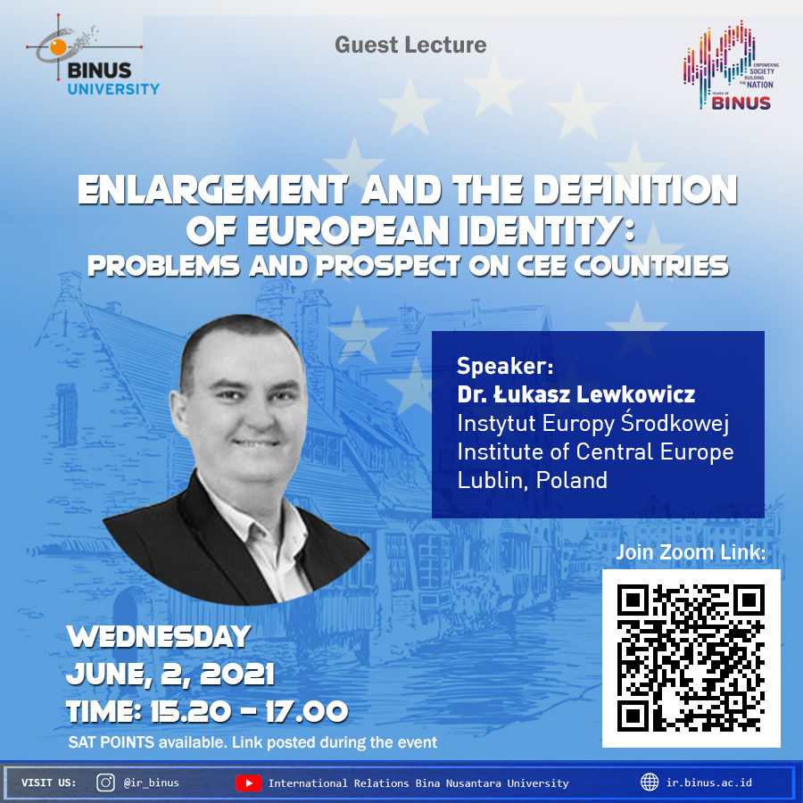 On Wednesday, 3rd June 2021, the Department of International Relations at Binus University held a guest lecture as a part of the EU and European Integration course. Taking “Enlargement and the Definition of European Identity: Problems and Prospect on CEE Countries” as the theme, the guest lecture was delivered by Łukasz Lewkowicz, Ph.D. from the Institute of Political Science and Administration at Maria Curie Skłodowska University in Poland. It was held virtually via Zoom for two hours and attended by International Relations Global Class students who take the course this semester.