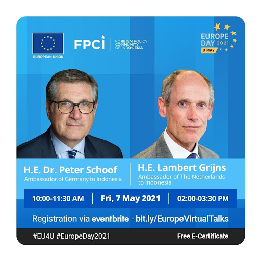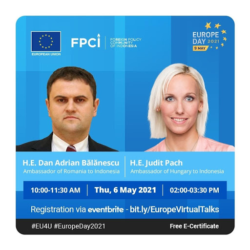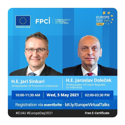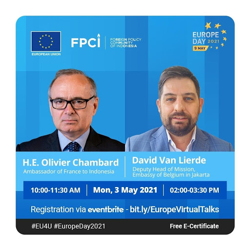 Maka dari itu, pada tanggal 1-8 Mei 2021, dilaksanakanlah rangkaian diskusi virtual bersama para Duta Besar Eropa untuk Indonesia. Rangkaian diskusi virtual ini menjadi kegiatan yang sangat berguna bagi para mahasiswa Hubungan Internasional karena dapat berinteraksi langsung (melalui chatbox Youtube) bersama para Duta Besar Eropa. FPCI Chapter BINUS University memiliki kesempatan untuk ikut menyukseskan rangkaian acara ini dengan cara mendorong para mahasiswa Hubungan Internasional dan penggiat kebijakan luar negeri untuk turut hadir dan aktif dalam bertanya. Tentunya, wadah interaksi ini menjadi manfaat bagi para mahasiswa Hubungan Internasional BINUS University dalam menggapai wawasan mengenai Eropa, Uni Eropa, dan para negara anggotanya.