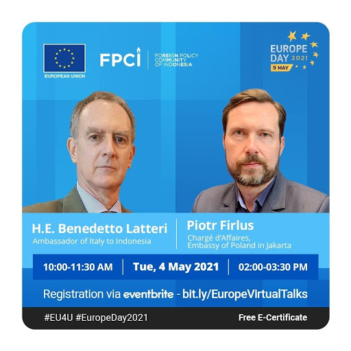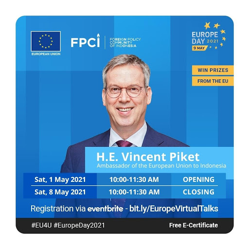 Road to Europe Day 2021 adalah acara yang diselenggarakan oleh Foreign Policy Community of Indonesia (FPCI) yang bekerjasama dengan Uni Eropa. Acara Road to Europe Day 2021 merupakan acara virtual talk yang ditunggu-tunggu oleh para penggiat kebijakan luar negeri dan hubungan internasional, dimana FPCI Chapter BINUS University juga turut antusias berpartisipasi dalam diskusi virtual ini. Europe Day (9 Mei) adalah hari selebrasi perdamaian dan persatuan di kawasan Eropa. Setiap tahunnya, dalam mendekati Europe Day, Uni Eropa menyelenggarakan kegiatan-kegiatan yang memiliki nilai dari hari spesial tersebut. Kepentingan Europe Day perlu menjadi perhatian yang penting di Indonesia juga, terutama bagi para mahasiswa maupun penggiat kebijakan luar negeri yang ingin fokus terhadap kawasan Eropa.