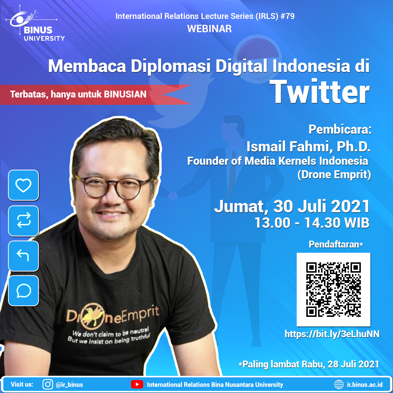 Pada tanggal 30 Juli 2021, jurusan HI Universitas Bina Nusantara (BINUS) menghadirkan Dr. Ismail Fahmi, pendiri PT Media Kernels Indonesia dan Drone Emprit Academic (https://dea.uii.ac.id/), untuk membahas bagaimana cara membaca berbagai isu terkait politik internasional (contoh: Aleppo di Suriah dan West Papua). Secara khusus, Dr. Ismail Fahmi mengulas performa diplomasi digital Indonesia di Twitter.