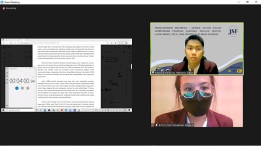 Universitas Bina Nusantara yang tergabung ke dalam FKMHII Korwil II mengirimkan dua delegasinya yaitu Benedictus Nathanael Davin & Putri Salsabila Azwardi sebagai perwakilan dalam sidang JSF 2021. Sidang JSF dilaksanakan secara kekeluargaan agar bisa mendapatkan solusi ataupun program yang komprehensif. Forum ini berlangsung selama tiga hari berturut-turut dengan total tujuh sidang. Dalam forum, kegiatan ini kerap dihadiri oleh narasumber kredibel dan ahli dalam menganalisis permasalahan perekonomian Indonesia, terutama UMKM. Hari pertama dibuka dengan webinar oleh Bapak Faisal H. Basri, S.E., M.A. & Ibu Dr. Shanti Darmastuti, S.IP., M. SI. Selanjutnya diikuti dengan sosialisasi JSF (JSF 101) oleh Presidium Wicaksono selaku Presiden Nasional FKMHII 2019. Rangkaian acara ini dilakukan untuk menjadi acuan dalam penyusunan Joint Communique yang menjadikan hasil dari forum ini. Hari kedua dan ketiga merupakan puncak acara dengan diadakannya serangkaian sidang penyusunan Joint Communique yang nantinya akan diserahkan kepada pemerintah oleh perwakilan JSF 2021.