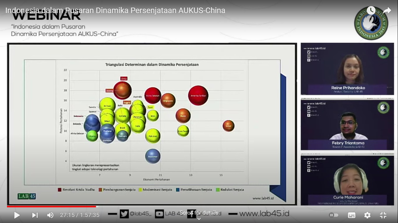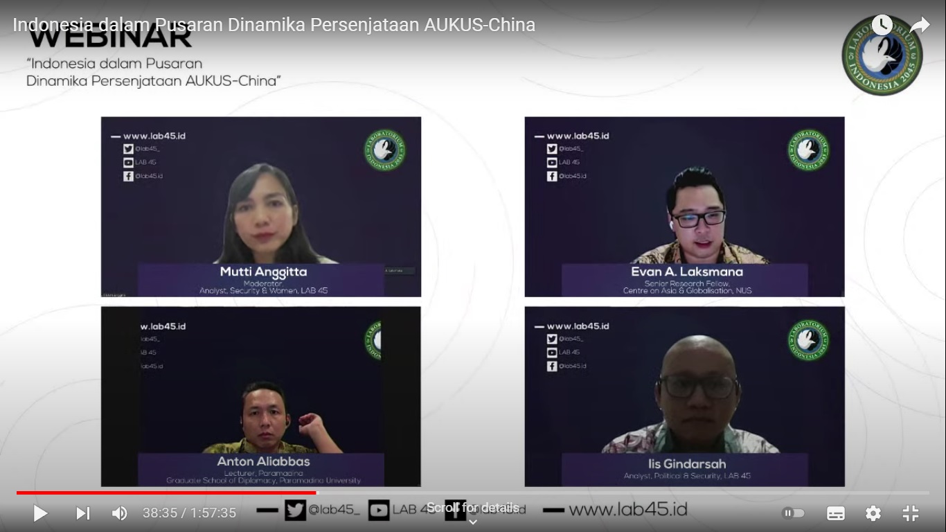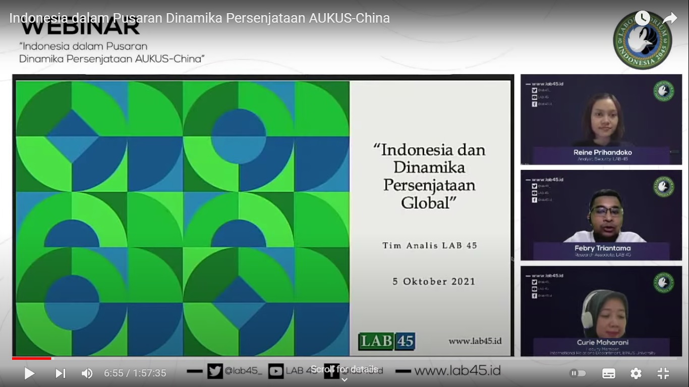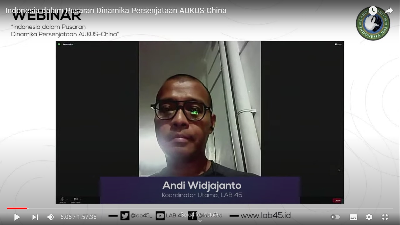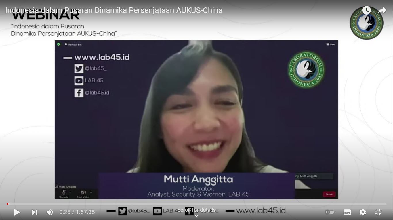 Webinar ini merupakan diseminasi hasil penelitian Lab 45 tentang dampak AUKUS terhadap dinamika di Laut China Selatan dan Indo-Pasifik. Webinar Tim peneliti Lab 45 terdiri atas Iis Gindarsah, Reine Prihandoko, dan Febry Triantama, serta Dr. Curie dari HI BINUS. Webinar diawali opening remark oleh Andi Widjajanto, analis utama Lab 45. Webinar dimoderatori oleh, Mutti Anggitta, analis utama Lab 45. Hasil penelitian Lab 45 kemudian dibahas oleh beberapa penanggap eksternal, antara lain Evan A. Laksmana, senior research fellow Centre on Asia and Globalisation National University of Singapore (NUS), dan Anton Aliabbas, dosen Paramadina Graduate School of Diplomacy Universitas Paramadina.