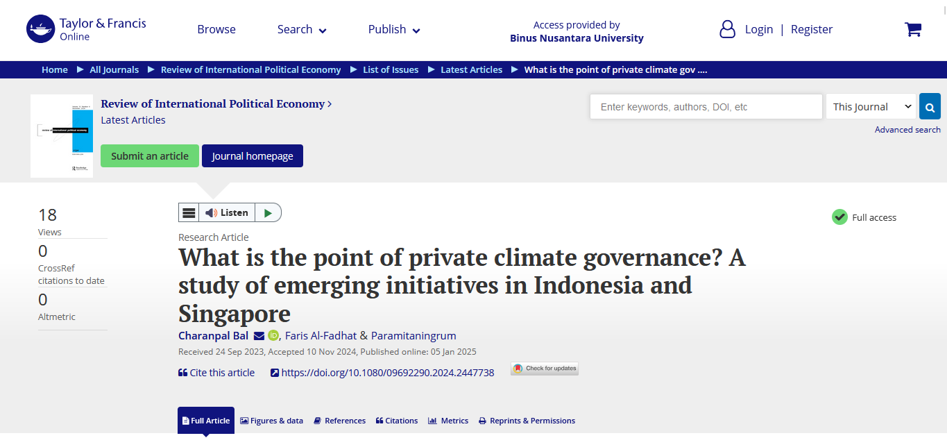 Dosen program studi Hubungan Internasional Universitas Bina Nusantara (HI BINUS), Dr. Charanpal Singh Bal dan Dr. Paramitaningrum, menjadi penulis bersama (co-author) artikel jurnal berjudul “What is the point of private climate governance? A study of emerging initiatives in Indonesia and Singapore”. Artikel ini ditulis bersama Prof. Faris Al-Fadhat dari Universitas Muhammadiyah Yogyakarta (UMY) dan diterbitkan pada jurnal Review of International Political Economy.
