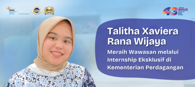 Talitha Xaviera Rana Wijaya, salah satu mahasiswa Hubungan Internasional, menjalani program magang di Kementerian Perdagangan Indonesia di Divisi Direktorat Jenderal Pengembangan Ekspor Nasional. Dalam kesempatan magang ini, Talitha terlibat langsung dalam berbagai kegiatan yang mendukung pengembangan ekspor negara.
