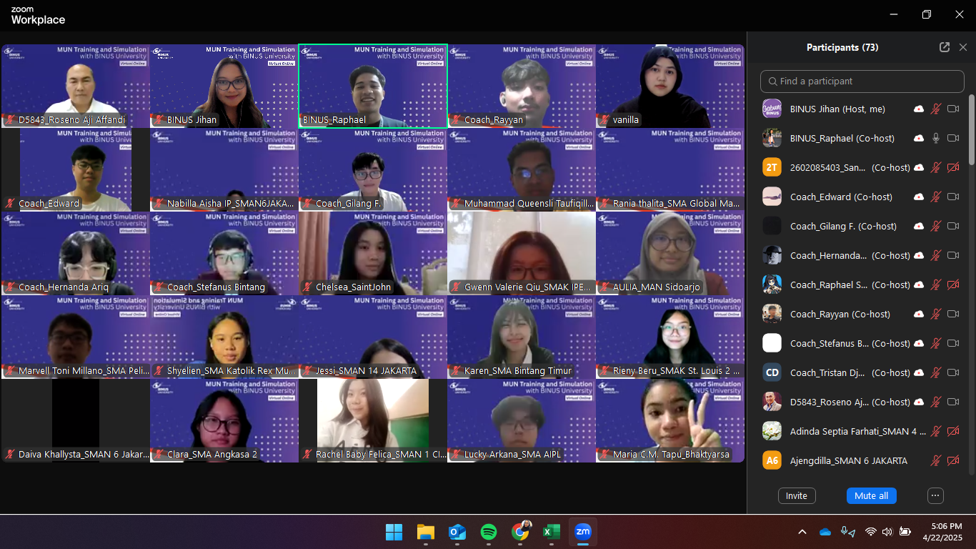 Program pelatihan ini terdiri atas enam sesi dengan topik berbeda. Sesi pertama bertajuk “MUN 101: Fundamentals of MUN – Research Guideline 101 & Solution Guideline 101” telah dilaksanakan pada Rabu, 22 April 2025, pukul 15.30 WIB melalui Zoom Meeting.
