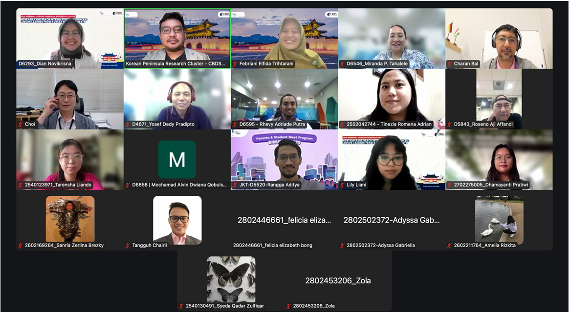 The Korean Peninsula Research Cluster, part of the Centre for Business and Diplomatic Studies (CBDS) in the Department of International Relations at Bina Nusantara University, held its inaugural webinar titled “How Han Kang Reaches International Audiences? Lessons Learned from a Korean Nobel Laureate”. The event, which took place on March 14, 2025, via Zoom, was attended by students, lecturers, and representatives from the Korean Foundation.