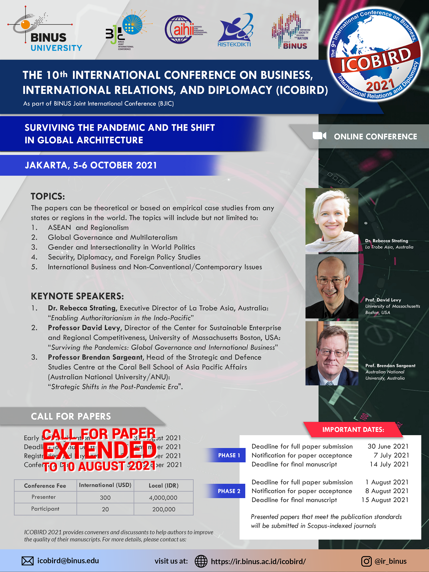 ICOBIRD 2021 also aspires to collaborate with the Indonesian Association of International Relations Studies (AIHII), therefore we intend to invite scholars from AIHII to become co-convenors in respective topics. As the scope of the conference is international, we aim to receive submissions from both Indonesia and overseas.